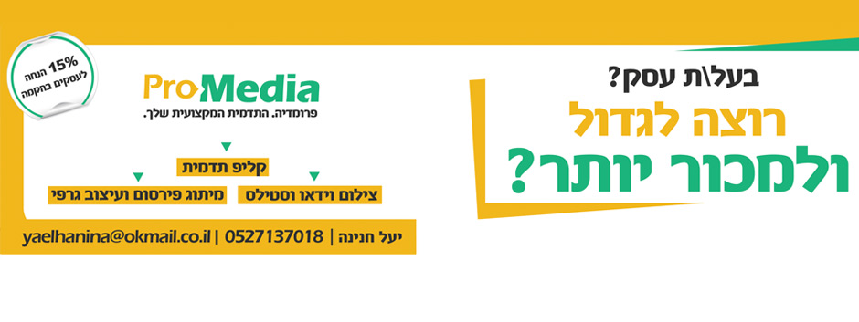 קצת עלייעל חנינה מנהלת את "פרומדיה הפקות" .פרומדיה הפקות מתמחה בהפקת סרטי תדמית, אנימציה וטריילרים שיווקים לעסקים.לפרומדיה מענה כולל לחומרים שיווקיים לעסק- חבילת תדמית גרפית, עיצוב, פרסום וצילום מוצרים.התדמית שלכם כעסק חייבת להיות מקצועית ומכובדת כדי להביא לקוחות חדשים ולהגדיל את היקף המכירות שלכם.התקשרו עכשיו לשיחת יעוץ חינם! פרומדיה- לנצח בכל מדיה! נהיה בקשרהשאירו פניה בטופס ונחזור אליכם בהקדם! שם (חובה) דואר אלקטרוני (חובה) טלפון (חובה) תוכן ההודעה Δ פרטי יצירת קשר: 052-7137018 [email protected] רח' דוד הראובני 2 ירושלים "יעל חנינה - פרומדיה" מופיעה בחברות להצלחה בתחומים : מקצועות חופשיים, אירועים, מחשבים ואינטרנט.לרשימת העסקים המלאה של חברות להצלחה לחצי כאן